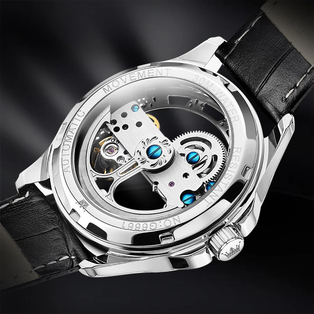 OLEVS Luxury Men Watches Automatic Mechanical Wristwatch Skeleton Design Waterproof Leather Strap Male Watch Reloj Hombre